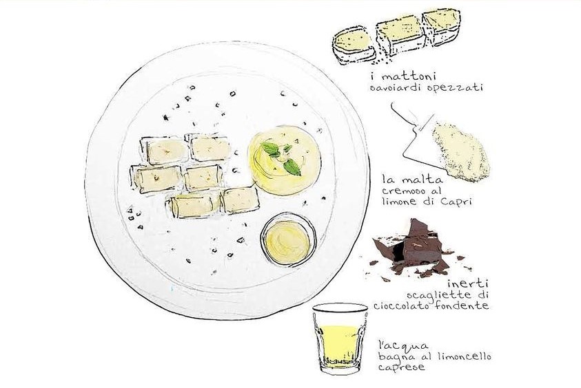Al tradizionale tiramisù, infatti, è stato aggiunto sia il limone che il limoncello, che richiamano, of course, la terra dei Faraglioni, ma anche il cioccolato, “sposo” delle mandorle nella regina dei dolci isolani, per antonomasia, la torta caprese. Tocco di estro e fantasia per questa “scomposizione” di tiramisù al limone è stato l’abbinamento degli ingredienti ai componenti di una costruzione, un modo per richiamare anche alle origini di un’isola che ha fatto e fa delle ville imperiali di epoca romana il suo vanto e la dimostrazione della capacità di un edificio ben costruito di resistere all’inesorabile trascorrere del tempo. E così il “Tiramisù al limone da costruire” diventa la rappresentazione dei mattoni con dei savoiardi spezzati, della malta con il cremoso al limone di Capri, degli inerti trasformati in scagliette di cioccolato fondente mentre il ruolo dell’acqua viene svolto da una bagna di limoncello caprese, il tutto servito e presentato in un piatto che nei suoi riflessi in trasparenza omaggia l’azzurro mare dell’isola più ambita del mondo. Insomma se è vero che le ville imperiali di Tiberio a Capri hanno fatto storia, dopo oltre duemila anni il “Tiramisù al limone da costruire” entra come una moderna dimora nell’ideale libro dei dolci da comporre per dare vita ad un capolavoro che arricchirà la “galleria” dei miti isolani.