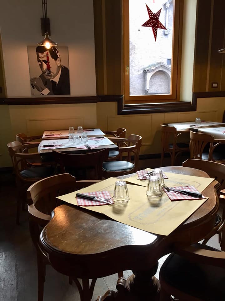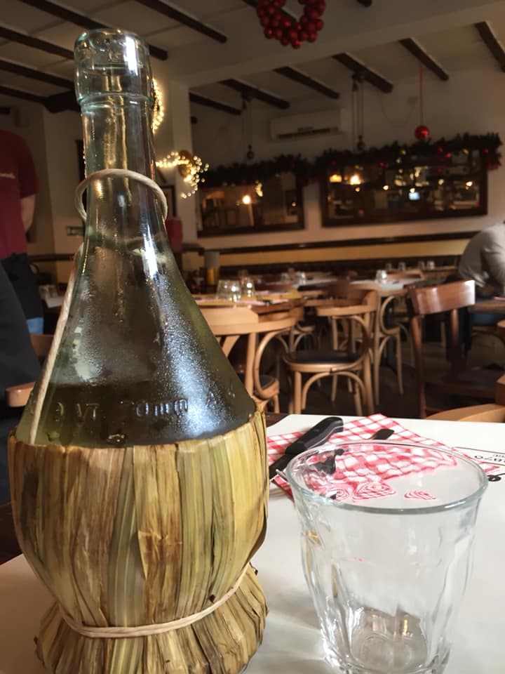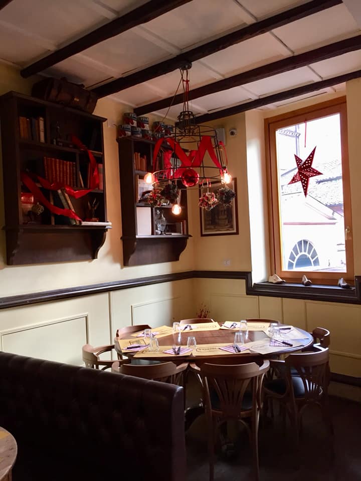 La sala al primo piano è la più grande, arredata con qualche bel tavolo in stile che si alterna a quelli da bistrot per 4 posti, più pratici e salva-spazio. Gli arredi sono molto meno folcloristici di quello che ci si potrebbe espettare da un posto ad alta frequentazione turistica, eccezion fatta per qualche particolare, come ad esempio i fiaschi impagliati usati per l’acqua.