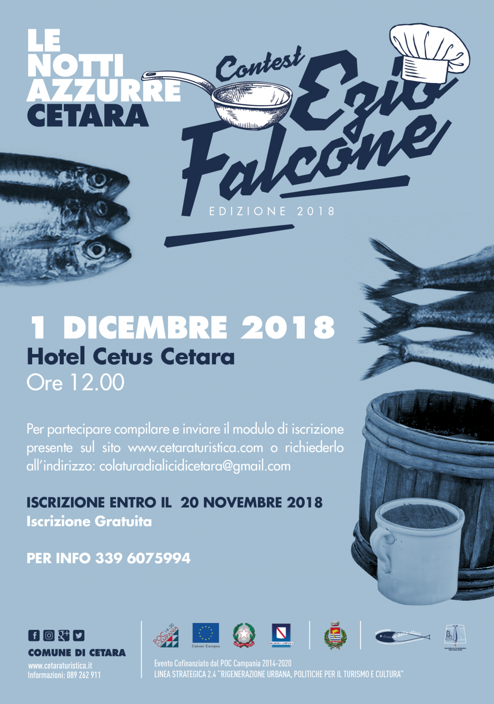 Costa d’Amalfi, 03 novembre 2018 – Ritorna a Cetara il premio “Ezio Falcone”, l’avvincente sfida ai fornelli, tra cultura e tradizione, per gli appassionati della colatura di alici. Il contest gastronomico, nato in onore dello storico Ezio Falcone, che ha rivolto il suo studio all’enogastronomia della Costiera Amalfitana, si terrà a Cetara, sabato 1 dicembre alle ore 12, presso l’Hotel Cetus.