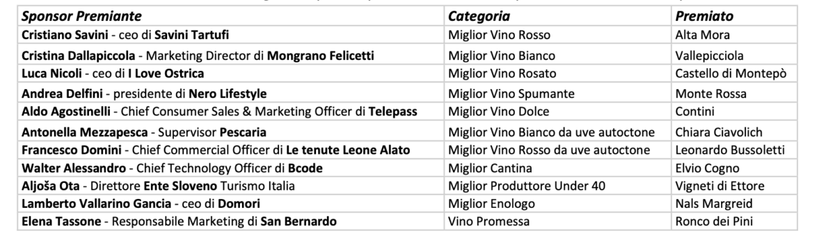 A seguire Gardini ha premiato vini in base alle categorie Vini sotto i 15 euro, Vini bio, Vini orange/macerati, Vini bianchi esteri, Vini rossi esteri, Champagne e Vini da investimento.