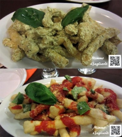 – Scugnizzielli al finto ragout e al pesto di basilico fresco. Gli Scugnizielli sono strisce di pasta di pizza, fritte e poi condite con salsa di pomodoro ristretta a fuoco lento senza carne (finto ragout o ragù) o pesto preparato con pinoli, olio, aglio e basilico fresco. Come antipasto sono efficacissimi.