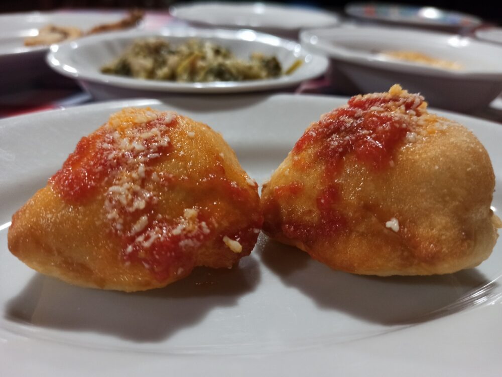 Nel frattempo cominciano ad arrivare le portate dell’antipasto iniziando da una classica fellata di Salumi nazionali ed eccellenti formaggi locali. Poi in sequenza arrivano -le Olive, -la Mortadella grigliata, -le Bruschette, -il Pancotto con Broccoli e Fagioli, -i Pereroni con le Patate, -i Rustici, -‘O Musso, -le Montanarine, -la Fritturina composta da: Involtini di Melanzane, Polenta fritta, Crocchetta di patate con cuore fondente e spettacolari Frittelle ripiene di salame piccante.