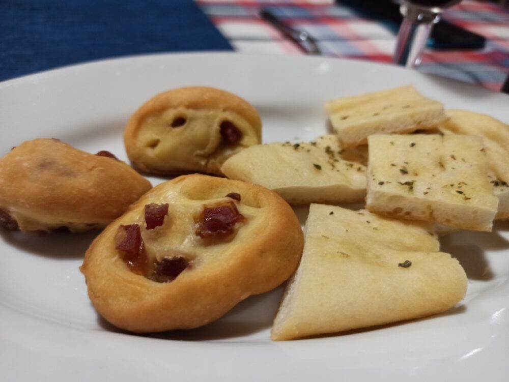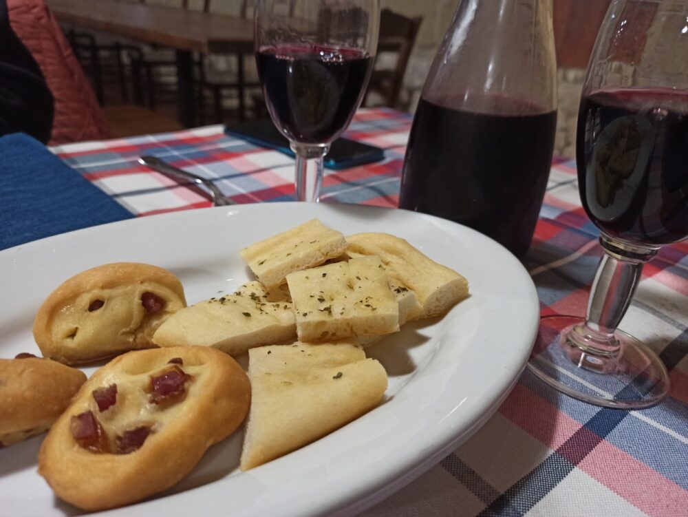Insieme al buon Vino della Casa (5 euro a lt.) arriva l’aperitivo composto dal mini panini napoletani e una focaccia con rosmarino e con l’immancabile olio locale ricavato dalle tante piante d’ulivo che circondano il casale.