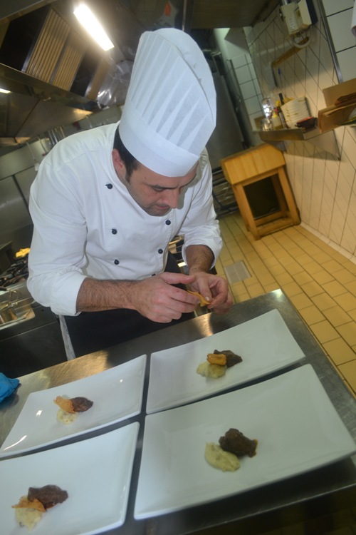 Dopo lo sgroppino alla mela verde e lime in cromatura di bosco, si passa alla guancia di maialino brasata con “micciato” (vino tipico pimontese) a bassa temperatura.
