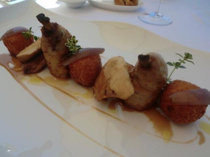 Angiolieri, pollo ruspante baby con crema pasticciera salata e fritta, cipolla di Tropea cotta al sle e jus al miele