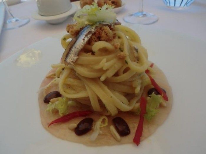 Angiolieri, linguine ammolicate su carpaccio di ricciola, olive nere di Gaeta, insalatina di scarola e crumble salato profumato all'arancia
