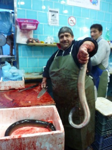 Divisi in due vasche – di qua i più piccoli (16 euro al chilo) e, di là, i più grandi (18 euro al chilo) – nelle quali si riversa di continuo acqua fresca e gelata, i capitoni, scivolando l’uno sull’altro e boccheggiando come in cerca di conforto reciproco, attendono il proprio destino: un coltellaccio o una mannaia.
