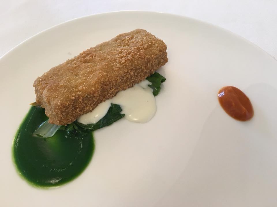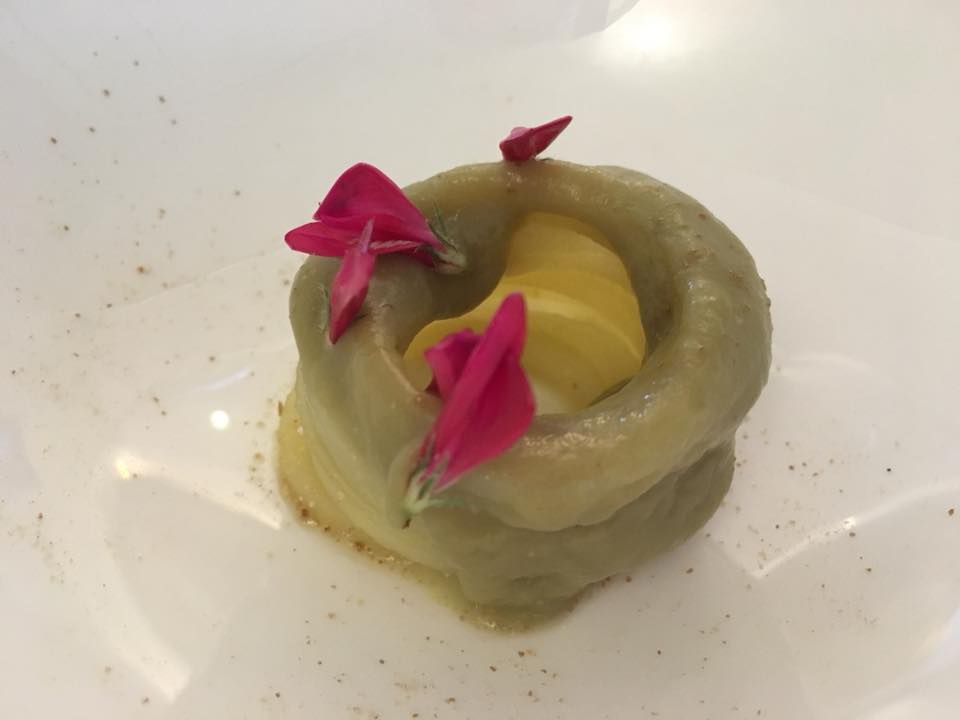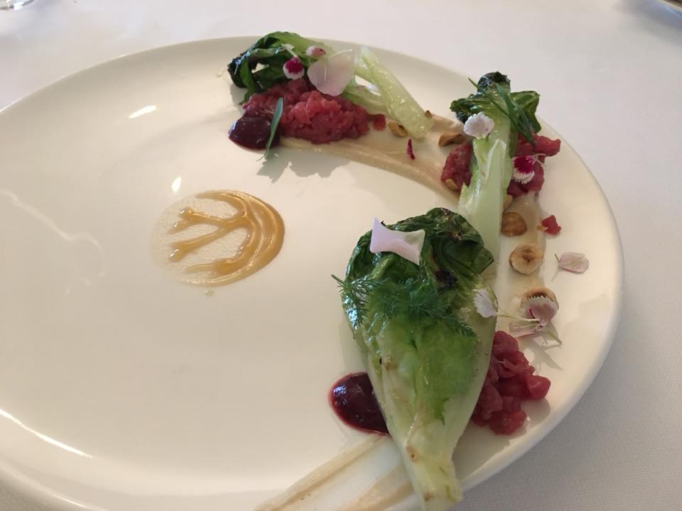 Nella tartare con la verdura cotta alla brace apparentemente semplice c’è un gioco sofisticato tra il crudo e la sensazione di carne passata sul fuoco che ricaviamo attraverso l’elemento vegetale. Un piatto di estrema semplicità ma che ha alle spalle una grande complessità di pensiero e di padronanza tecnica.