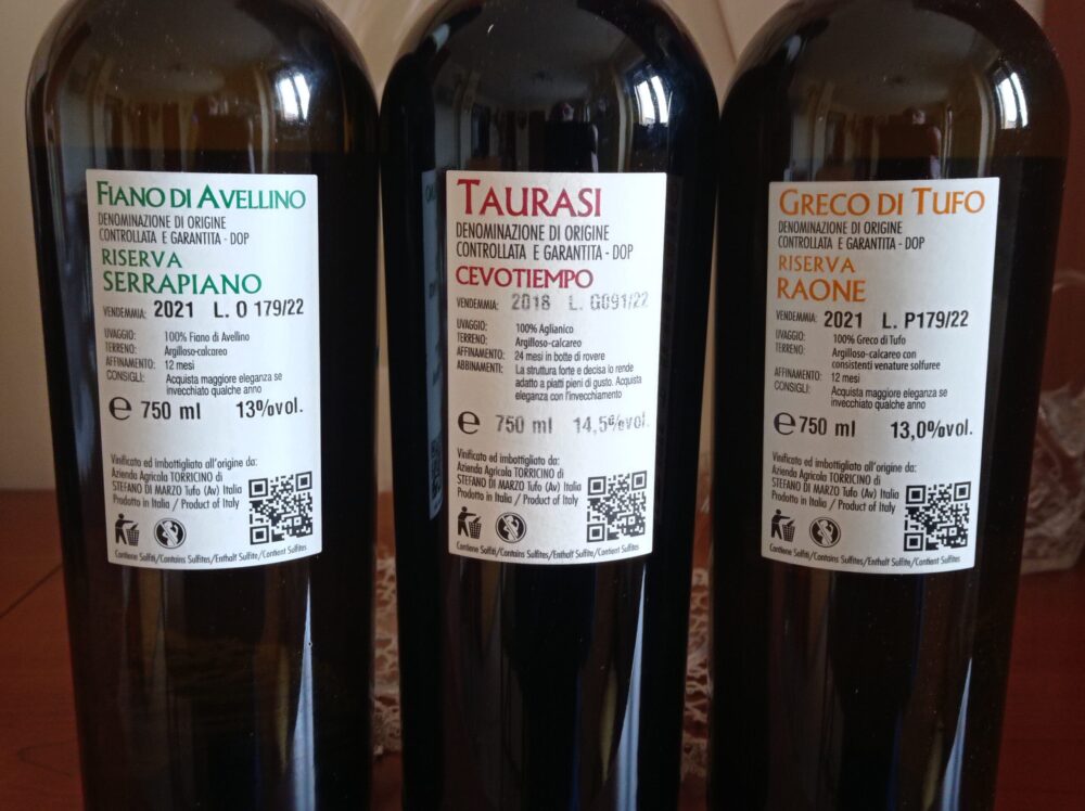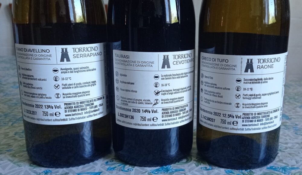 Ecco qui tre esplicative etichette di una famosa seppur minimale azienda irpina, quella di Torricino appartenente a Stefano, Maria Concetta e Federico Di Marzo, insediata nel vocato comune di Tufo.