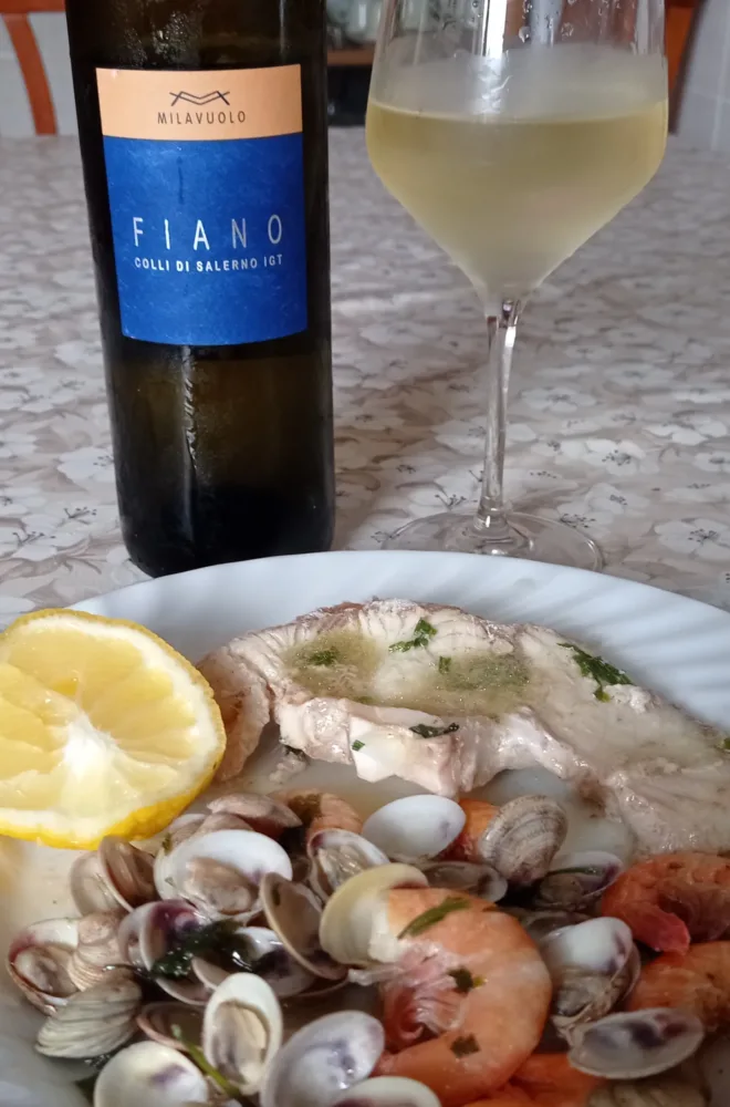 Fiano Colli di Salerno Igt 2mila22. Soltanto Fiano maturato in acciaio per otto mesi e poi affinato in vetro per ulteriori sei mesi. Tasso alcolico di tredici gradi. Prezzo finale di 17,00 euro.