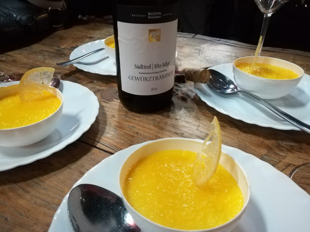 La Vinoteca, gestita da Luigi Esposito, uno dei componenti di una famiglia nota in città per la commercializzazione del Baccalà da tre generazioni, è stata ricavata negli antichi locali dove i nonni si dedicavano alla trasformazione dei prodotti provenienti dal Nord Europa. Sono circa 20 anni che Luigi propone i vini da lui stesso selezionati, e da un pò di tempo offre degustazioni abbinate per la maggiore a piatti a base di Baccalà e anche di Stoccafisso. Quindi gli chiedo di sorprendere i nostri ospiti non solo con un buon calice di vino ma anche con qualche sfizio di Baccalà. La proposta in un primo momento fa storcere il naso il naso ai commensali e a dire il vero un poco pure a me, ma incuriosisce tanto che decidiamo di accettare la sfida. Ci viene dunque servita una bottiglia di Gewurztraminer, un bel bianco di 15% imbottigliato nella Cantina Sociale di Bolzano, che si abbinerà meravigliosamente al semifreddo che da li a poco ci sarà servito.