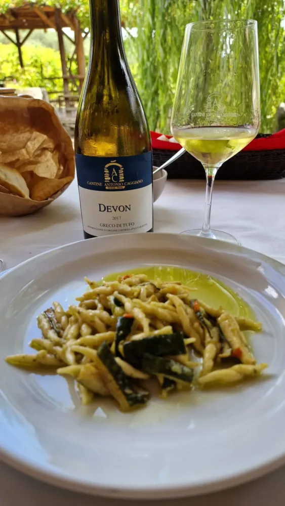 Immersi tra le vigne dell’azienda, seduti ad un tavolo con una meravigliosa vista sulla vallata circostante, ci vengono portati dei buonissimi piatti della tradizione irpina ai quali vengono sapientemente abbinati i vini di proprietà.