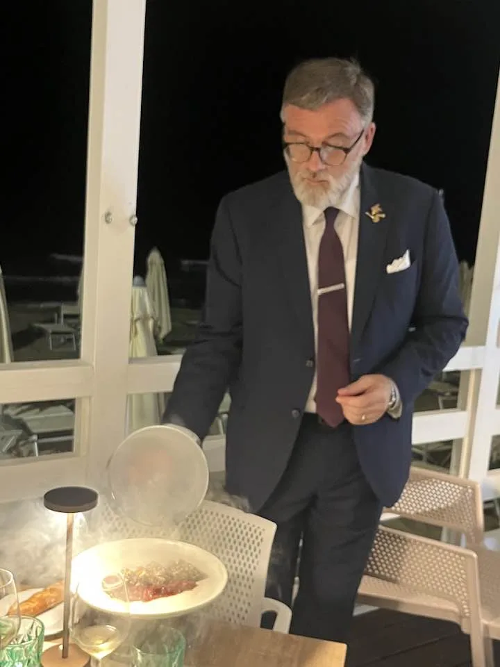 VistaMare è il ristorante del lido del Grand Hotel Virgilio, una bella struttura dotata di spa e piscina. Quest’anno al timone c’è un maitre e restaurant manager di grande bravura, Antonio Scherillo, che ha decenni di esperienza e titoli da raccontare (sommelier, referente Amira, assaggiatore di salumi, formaggi, caffè, discepolo di Escoffier ecc). Un maestro dell’accoglienza.