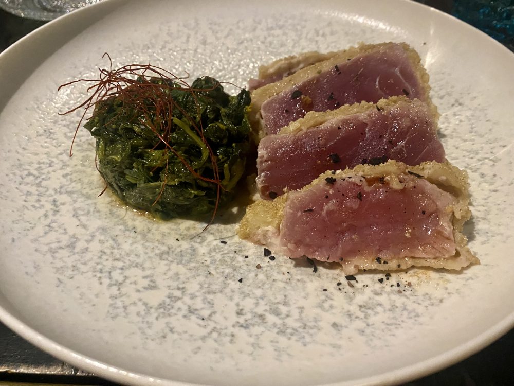 Tra i secondi c’è un’ottima Finta Cotoletta di tonno alla milanese, dove la cottura calibrata evidenzia la panatura leggera e nel contempo croccante, servita con i friarielli ripassati.