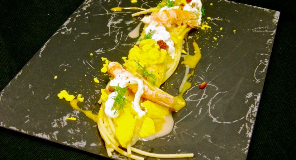 Spaghetti con carbonara di scampi e burrata di Alessandro Dal Degan – photo by Chiara Covolo