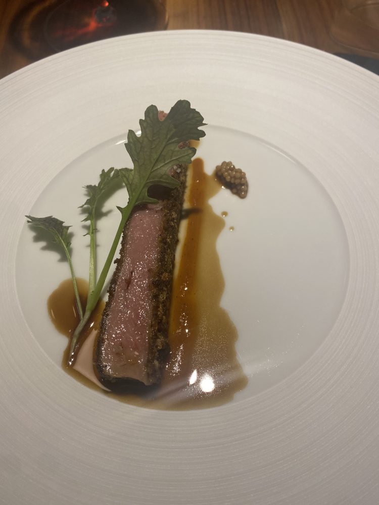 Sui secondi Antonio mostra tutte le sue basi classiche. La razza cotta con la salsa maître d’hotel, a base di burro, prezzemolo e fumetto di pesce, servito con il topinambur in due consistenze, fritto ed in crema, terminata con il lemon curd ed una salsa di dragoncello. Il piccione e mela, la zampetta da rosicchiare ed il petto servito con la propria salsa, in accompagnamento una terrina di fegatini laccata con vino rosso e mele e poi una mostarda di mele cotogne. Infine il capriolo, la sella è servita con la propria salsa, crema di castagne aromatizzata al Gran Marniner, insalata di mirtilli e scalogno. Classicità si, ma con intelligenza, le note dell’acidità sempre presenti, tutto molto centrato.