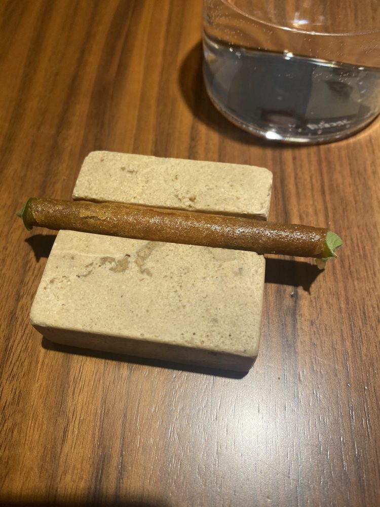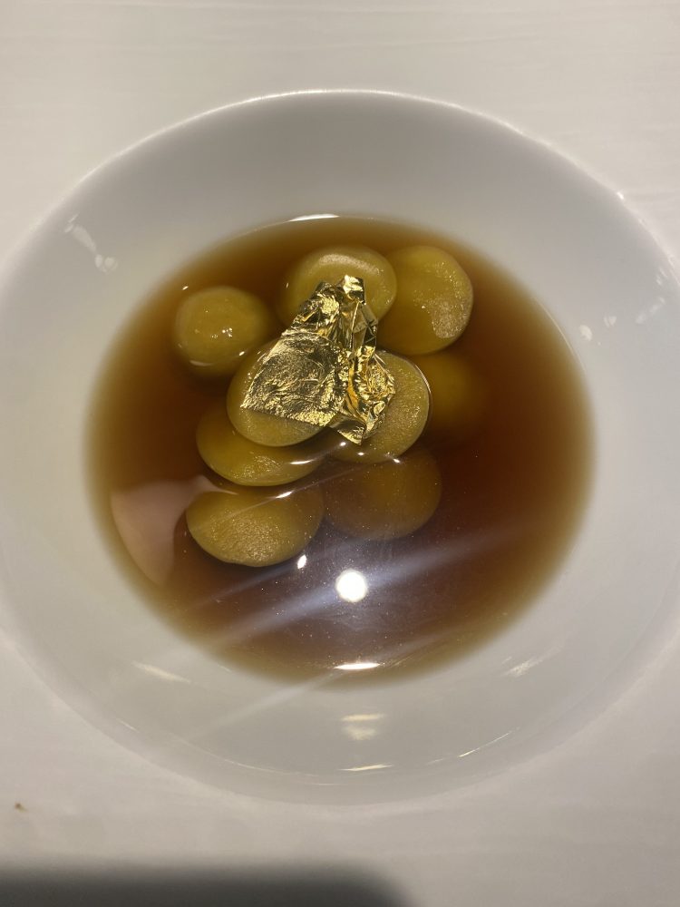 Il pre dessert è un macaron farcito con una terrina di foie gras e mosto cotto. Poi uva, alloro e bufala. Quattro tipologie di uva la bianca, la rosé, la pizzutello e la verjus, quest’ultima marinata una notte nel proprio succo e vengono servite con una crema di alloro, spuma di bufala, meringa fresca e cialda al cioccolato bianco. La nocciola, servita in tre consistenze, in crema, caramello e biscotto, camicia di cioccolato al latte e oro alimentare, in omaggio a Credric Crolet, veramente delizioso. L’altro piatto del viaggio insieme al panzerotto.
