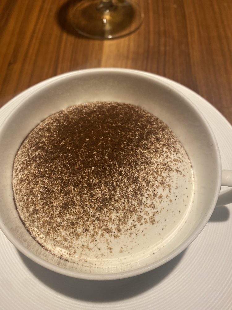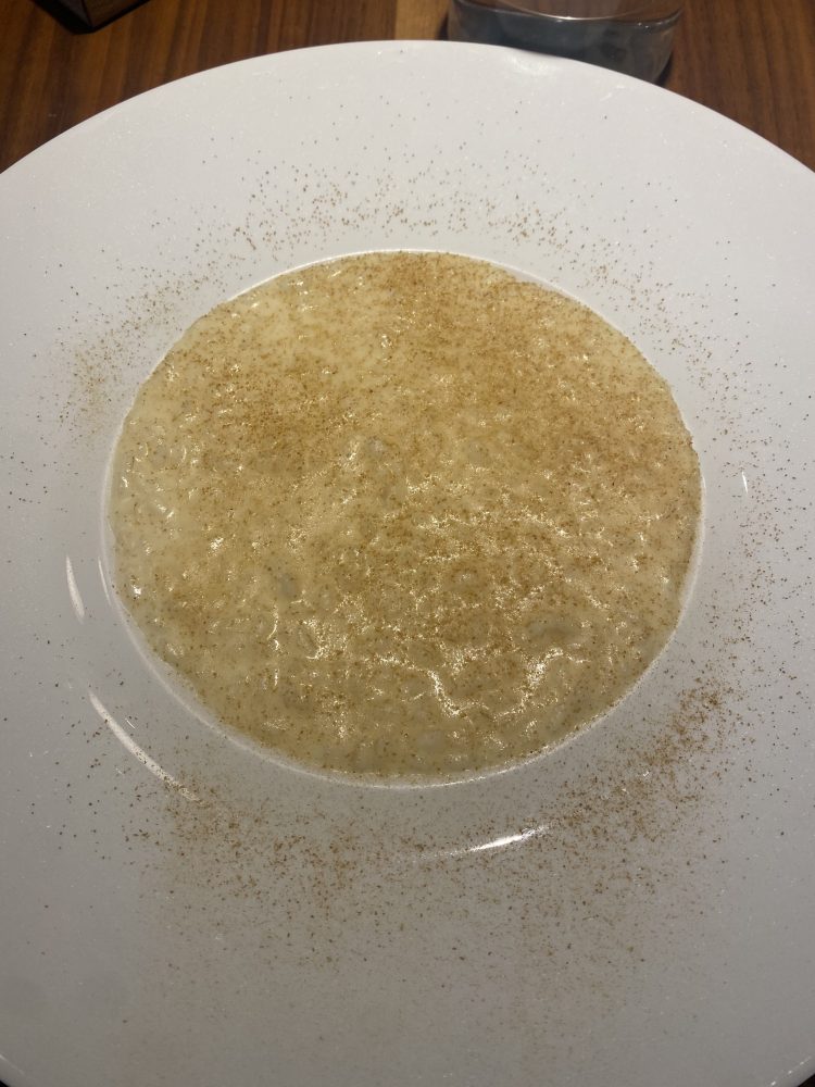 Un giro di formaggi e si chiude con il risolatte, caffè e cardamomo. La spezia riesce nell’intento di smorzare la dolcezza di un dessert relativamente semplice, che sa di colazioni dell’infanzia.