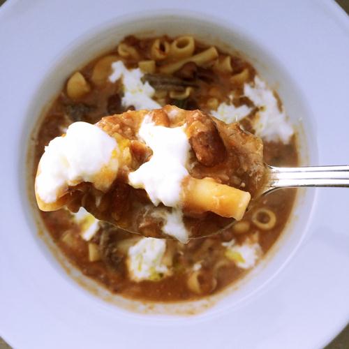 Zuppa di fagioli scritti con mozzarella stracciata e acciughe