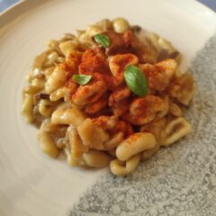 Setacciare insieme le due farine, fare la classica fontana e versare al centro l’acqua tiepida necessaria per ottenere un impasto sodo ma non eccessivamente duro....