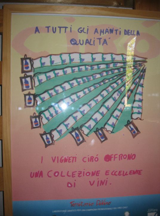Dopo un paio d’ore di girovagare (avrei continuato ancora, si prova una gran sensazione di pace e silenzio tra le vigne), torniamo nella piccola cantina, realizzata faticosamente da Francesco e Laura con l’aiuto della famiglia. Un bell’esempio di circuito virtuoso dalla vigna alle bottiglie, quindici.000, etichettate a mano secondo la destinazione, italiana o estera. In bella mostra il gran lavoro didattico realizzato in collaborazione con le scuole elementari e medie di Cirò. Un progetto che sta ricreando consapevolezza e orgoglio del proprio territorio dei giovani cirotani, spingendoli a non partire, a proseguire il lavoro dei genitori nelle vigne. Non è facile, ma l’entusiasmo di Francesco e le iniziative di altri grandi produttori stanno producendo gran fermento a Cirò.