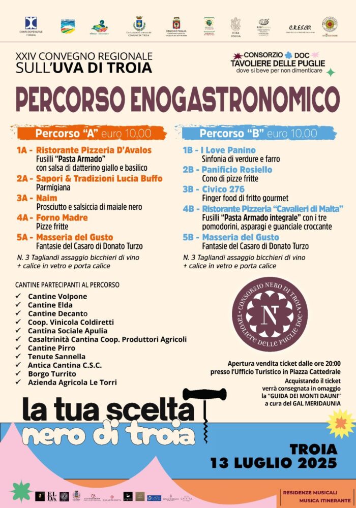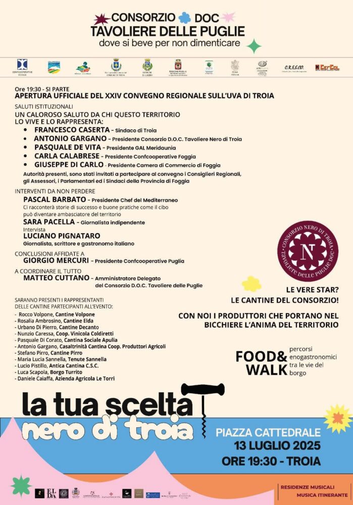 Fervono i preparativi per lโedizione 2025 del Convegno Regionale sull’uva di Troia, organizzata dal Consorzio di tutela del DOC โTavoliere” e Confcooperative Foggia . L’appuntamento รจ fissato per ๐ฑ๐ผ๐บ๐ฒ๐ป๐ถ๐ฐ๐ฎ ๐ญ๐ฏ ๐น๐๐ด๐น๐ถ๐ผ a partire dalle ore 19 nella piazza della cattedrale di Troia. Al termine del convegno seguirร un percorso enogastronomico, unโoccasione per degustare il vino prodotto con il vitigno Uva di Troia, accompagnato da prodotti gastronomici tipici del territorio dei Monti Dauni ed arricchita da un piacevole intrattenimento con musica dal vivo, che ha visto nelle edizioni precedenti unโaffluenza di circa duemila persone.