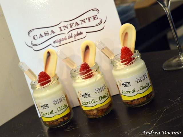 Chiusura dolce con il nuovo “buccacciello” ideato da Marco Infante di Casa Infante: crumble di Quaresimali con cremoso al cioccolato al caramello Dulcey Valrhona, cuore di confettura di mango Alphonso e crema di latte, con fiala di gocce di Frangelico. Il cucchiaino affondava con piacere in quel mare piatto che, sondato, rivelava buon gusto nel pairing e nella scelta delle materie prime.