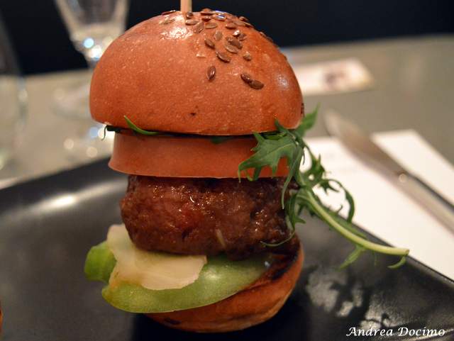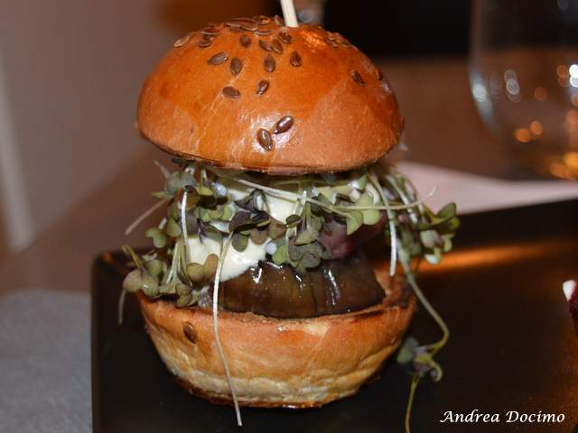 Estiva, ritemprante e d’autore la trasposizione delle tradizionali zucchine alla scapece in un panino d’ispirazione americana. “Scapesce” il nome scelto da Sposito per la sua creazione, ricalcando con l’aggiunta di una semplice “s” anche la materia prima cardine del panino. Dunque: burger di palamita, spuma di ricotta di pecora, zucchine alla scapece, foglioline di menta, insalatina di shiso (da noi conosciuto come “basilico giapponese”) e ketchup di rapa rossa. Ottimo il burger di questo pesce il cui nome scientifico è “Sarda sarda”, appena scottato all’esterno e con un buon riscontro palatale. Un panino davvero armonico: pregevole la scelta di adoperare il non comune shiso e simpatica quella di creare un ketchup con rape rosse. Promosso, decisamente.