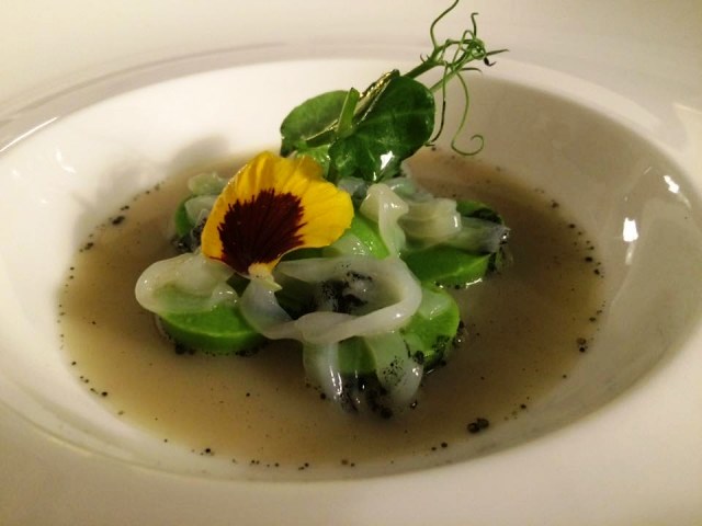 - Indaco, gnocchi di piselli e riccioli di calamaro, limone e brodo di pollo