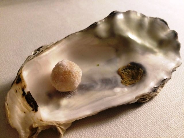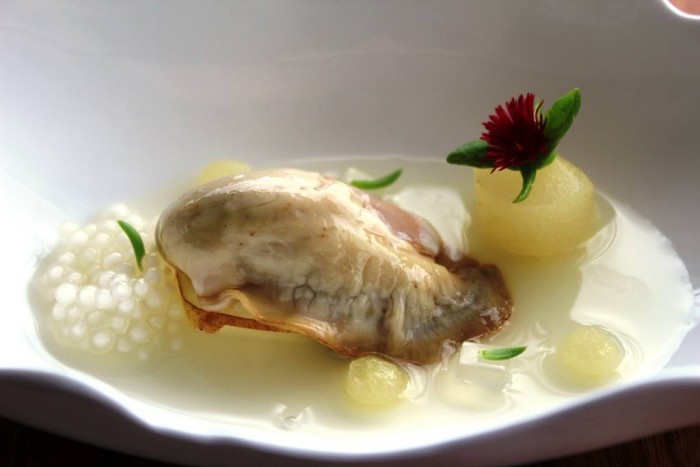 - Mirazur, ostriche con crema allo scalogno, pera e tapioca