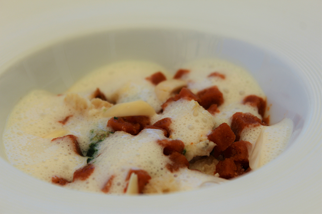 - Uliassi, pancotto al latte di mandorle con ricci di mare e mandorle