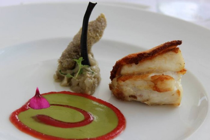 - Relais Blu, San Pietro in crosta di mandorle di Noto, caviale di melenzane, gazpacho di pomodoro verde di Nerano