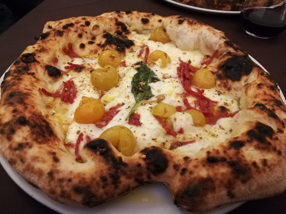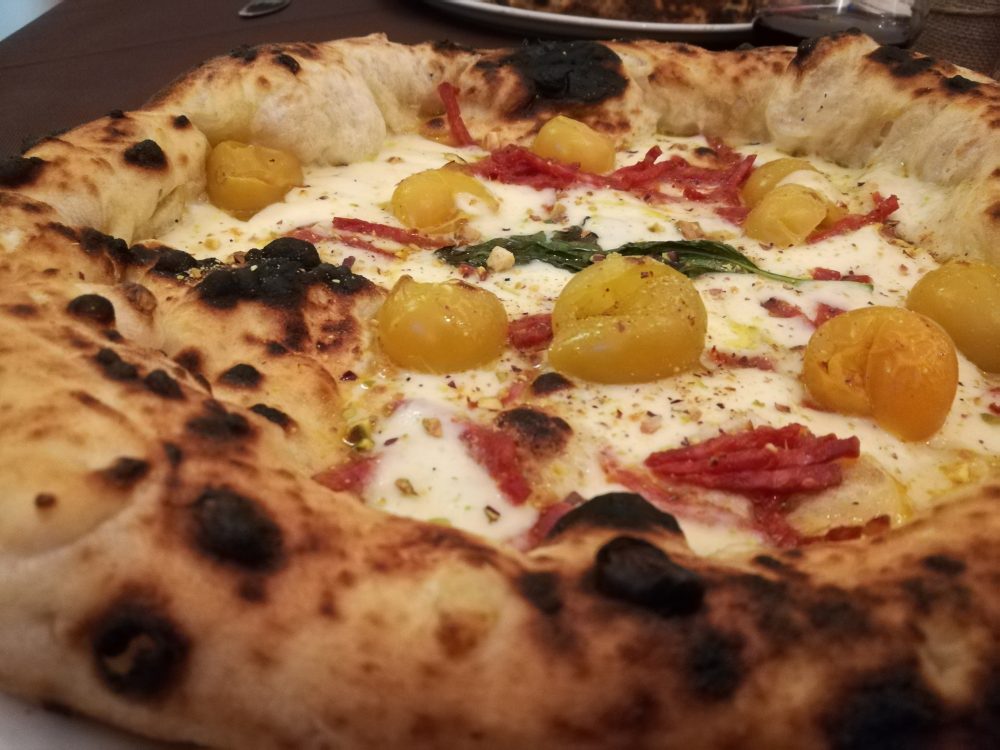 Ordiniamo due classiche: una Carrettiera con Friarielli e Salsiccia dei Nero Casertano, e una Diavola Bionda, ovvero una Diavola con Pomodorini Gialli, Salame piccante sempre di Nero Casertano e una sgranellata di Pistacchi.
