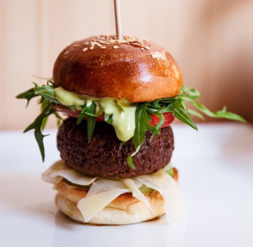 Hamburger di Chianina IGP laccato in salsa Teryaki, Pomodoro di Sorrento Acerbo e Maturo, Foglie di Mizuna, Maionese di peperoncini verdi, Chiffonade di Zenzero in Agrodolce.