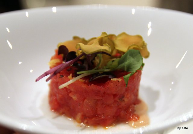 Giuseppe Causarano, Fattoria delle Torri, Modica, Ammennola ( sgombro con speck di tonno, mozzarella e mandorla verde)
