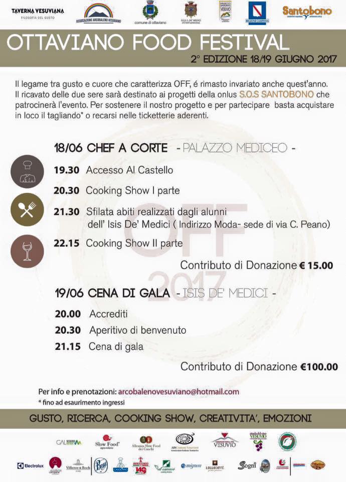 Oltre cinquanta chef provenienti da tutta la Campania, tra stellati e potenziali candidati all’ambìto riconoscimento assegnato dalla guida Michelin, si apprestano a ritornare alle falde del Vesuvio armati di padelle e di forte spirito goliardico per una imperdibile due giorni del gusto. Dopo il successo della scorsa edizione il 18 e 19 giugno torna, infatti, OFF – Ottaviano Food Festival, l’evento che intende promuovere e valorizzare le eccellenze e le tradizioni agroalimentari ed enogastronomiche del territorio vesuviano e regionale. Caratteristica immutata di OFF anche per questa seconda edizione sarà la finalità solidale dell’evento, in quanto i proventi delle due serate saranno devoluti interamente alla onlus Sos Sostenitori Ospedale Santobono.