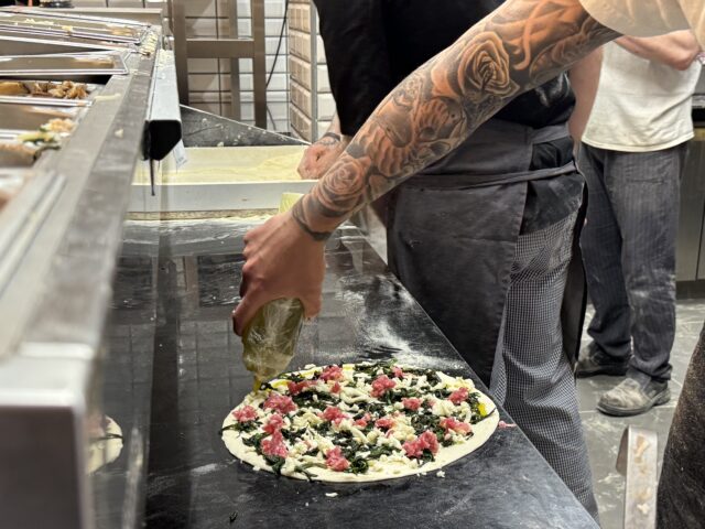 Jacopo ha sempre avuto le idee chiarissime per il suo secondo progetto: uno spazio con cucina e pizzeria a vista, due anime attaccate per coordinare il lavoro della squadra e controllare le varie preparazioni, con un occhio attento anche sulla sala. Nell’ampio laboratorio lavorano 4 pizzaioli, compreso Jacopo, accanto a due chef: Simone Ballicu e Federico Morocutti.