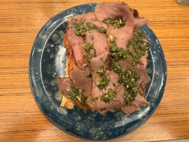 La seconda si chiama “Pancia Piena” (5€): un trancio di pizza al padellino con pre-fermento di lievito madre, farcito con pancia di maiale Kakuni, puntarelle e albicocche senapate. In questo caso, Jacopo ha utilizzato una ricetta giapponese che prevede una cottura brasata della pancia.