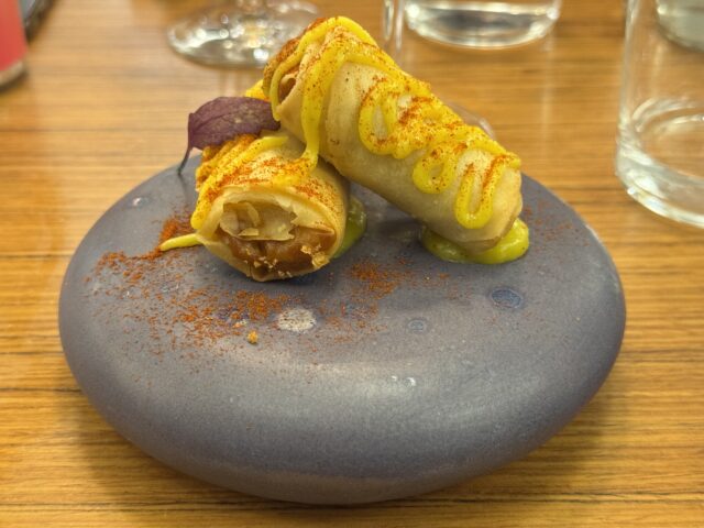 Interessante la “Polpo o chorizo?” (15€), condita con fior di latte, spinaci al burro, chorizo di polpo, crema di patate al forno, peperone crusco e acetosa. Il chorizo è realizzato con il polpo, che viene speziato e “trasformato” in salume, come succede in un ristorante stellato.