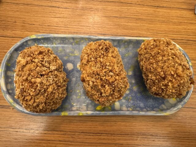 Molto buono anche il supplì guanciale, piselli e pecorino, panato con cipolla bruciata (4€): una sorta di gricia di piselli.
