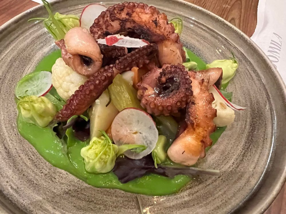 300mila, polpo primavra con giardiniera fatta in proprio e letto di crema di piselli freschi