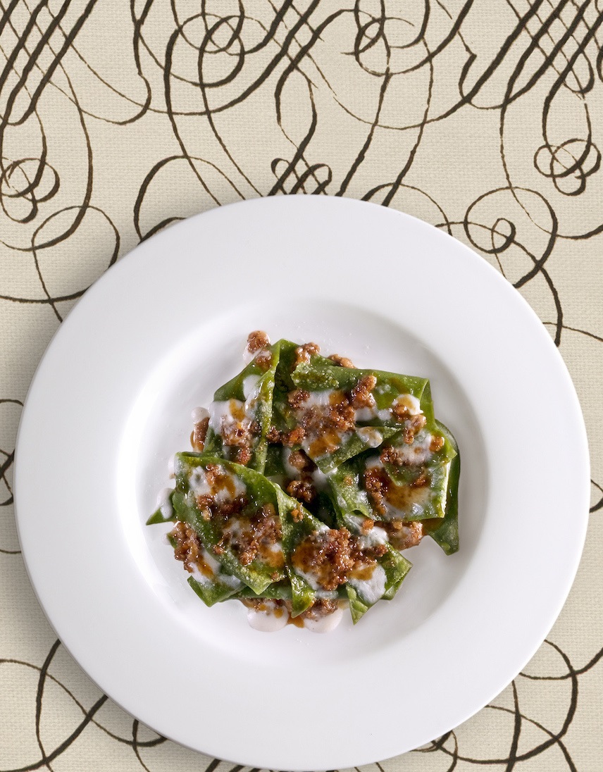 Le lasagne al verde sono fatte con ragù di vitello bianco e la pasta è sostituita dalla lattuga di mare. Un piatto d’avanguardia, però colmo di riferimenti alla tradizione, pur mantenendo il gusto della lasagna, sperimenta nuove forme e nuovi sapori.