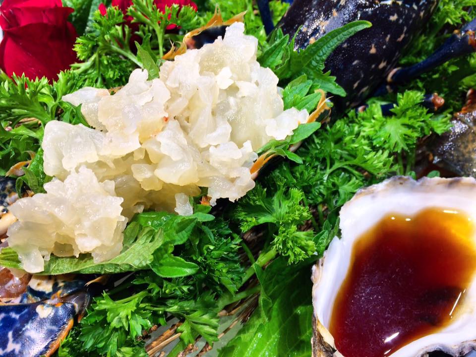 Numerosissime sono però le contaminazioni in fatto di sashimi. In primis il cosidetto Live Sashimi, un sashimi in cui la materia prima ancora si muove, preda degli impulsi elettrici. Sicuramente una portata scenica e d’impatto che però permette di assaporare la materia prima all’apice, al picco della propria freschezza. Notoriamente esso è preparato con i crostacei, con la piovra o con il calamaro irrorato di salsa di soia e limone per attivarne i riflessi. Quì è realizzato con un aragosta rossa ed un astice blu di Sardegna, serviti con una doppia salsa di accompagnamento, citrica e piccante. In Korea prende il nome di Hwe, in giappone Ikizukuri. L’Ikizukuri di pesce consiste in strisce fini come fogli o pezzi grandi come dita di sashimi, qualche volta guarniti con spicchi di limone, una decorazione di zenzero, oppure alghe secche di mare. Perfetto in abbinamento con una bollicina, un vino bianco frizzante o perchè no, un grande champagne robuto, dalla mineralità pronunciata.
