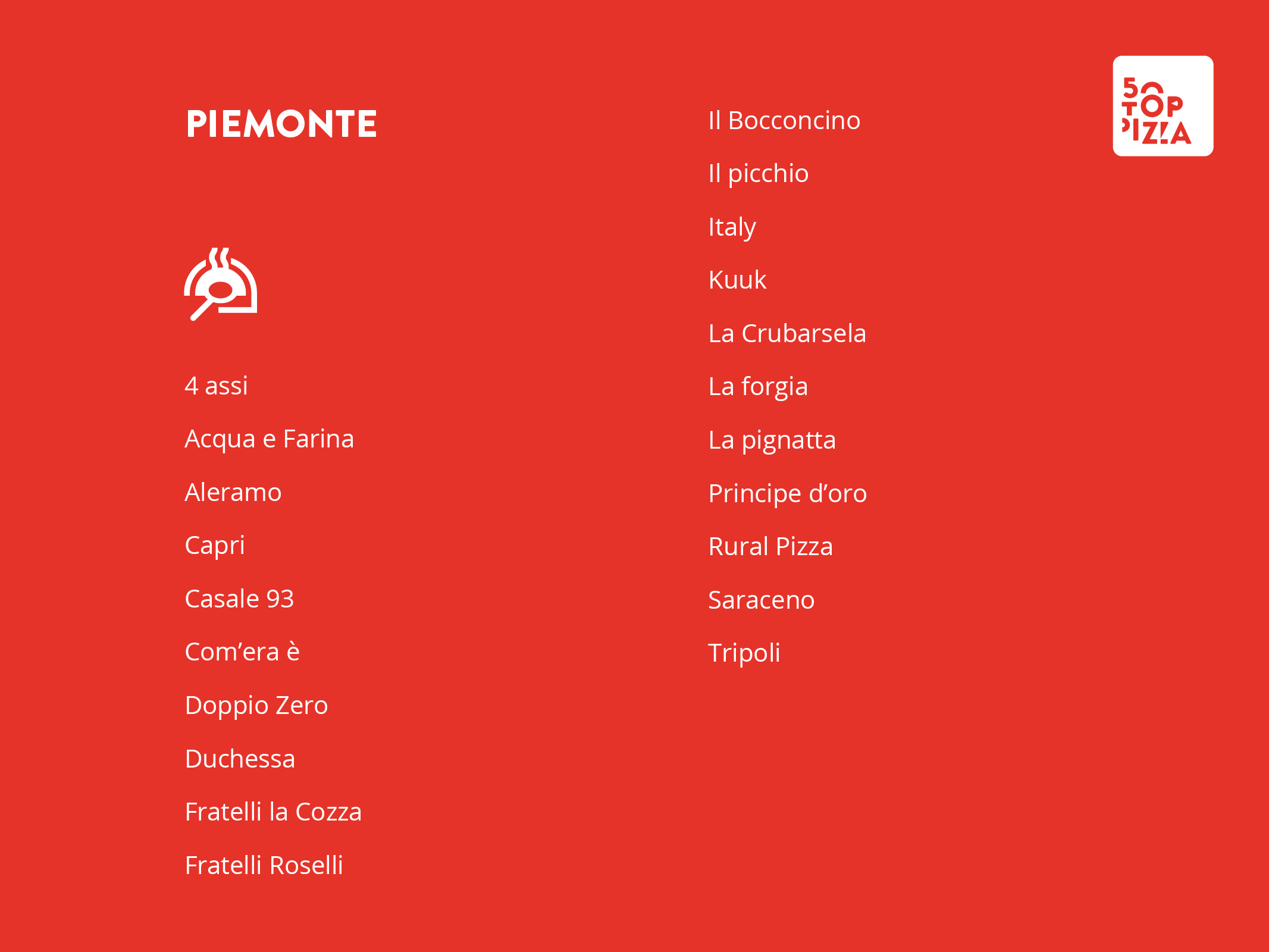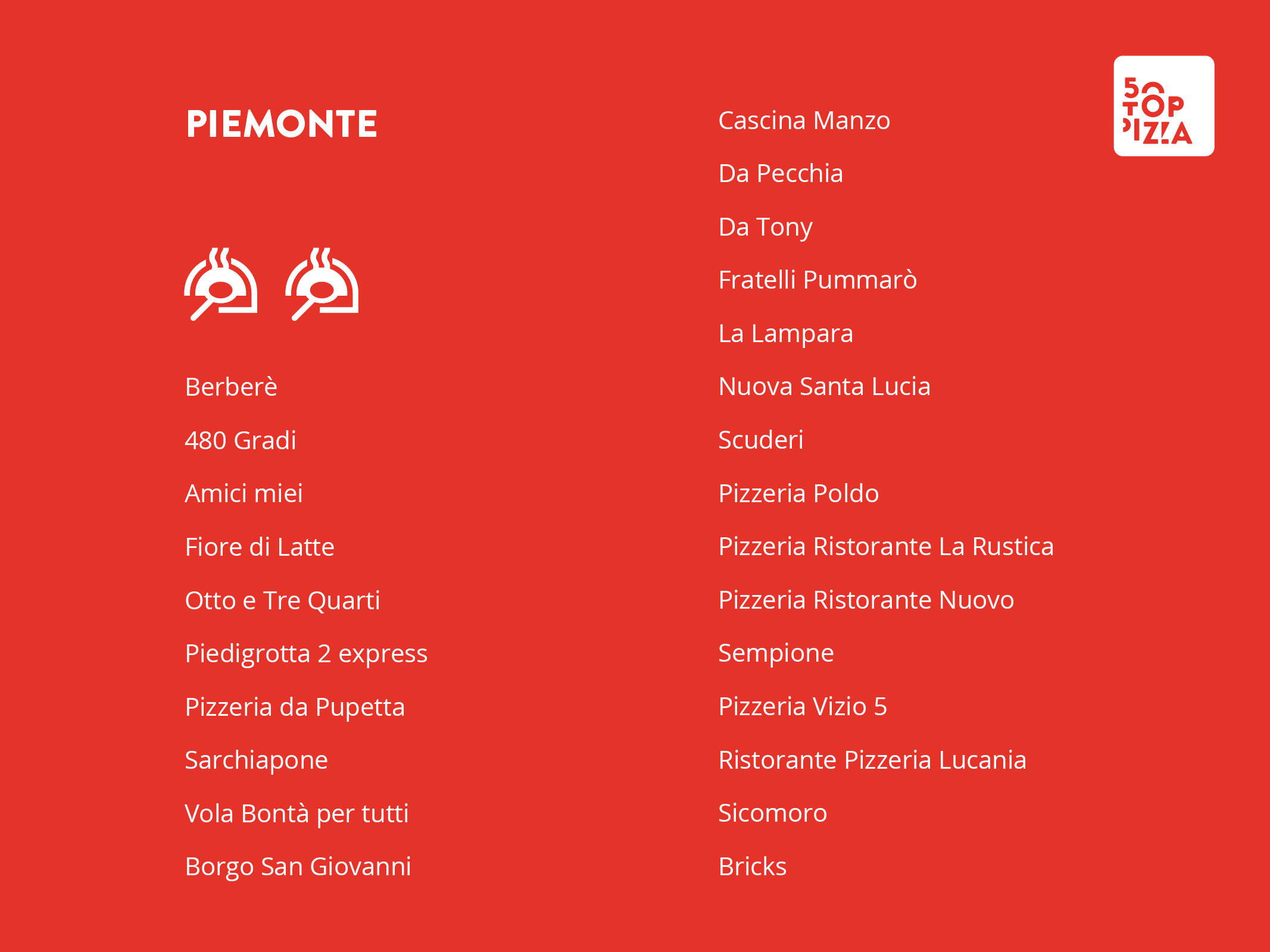 Piemonte: 24 pizzerie due forni; 45 pizzerie un forno; totale 69