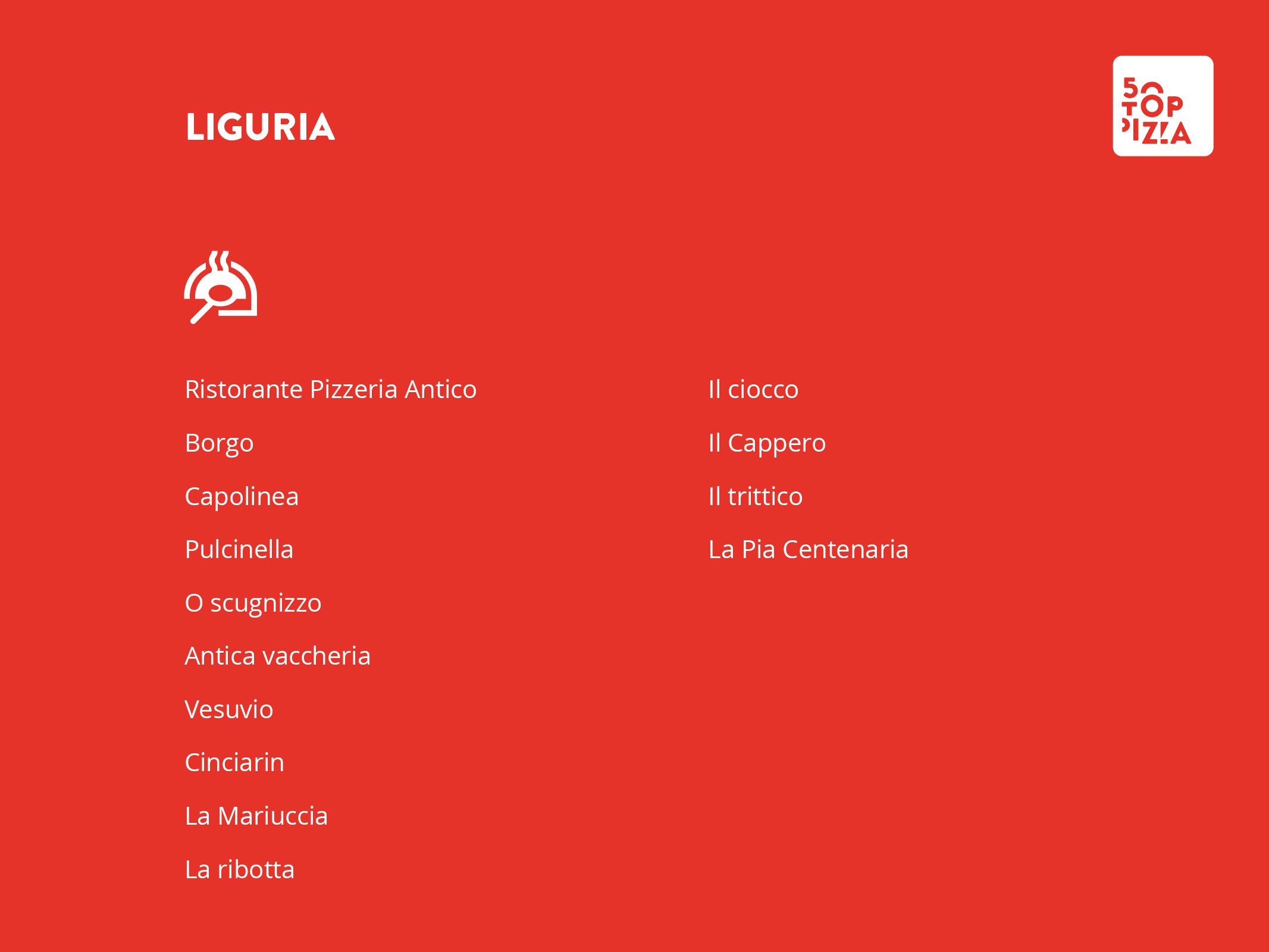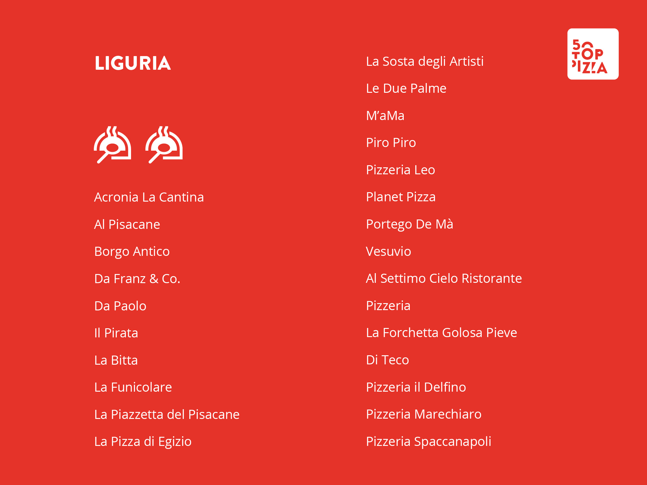 Liguria: 27 pizzerie due forni; 23 pizzerie un forno; totale 50