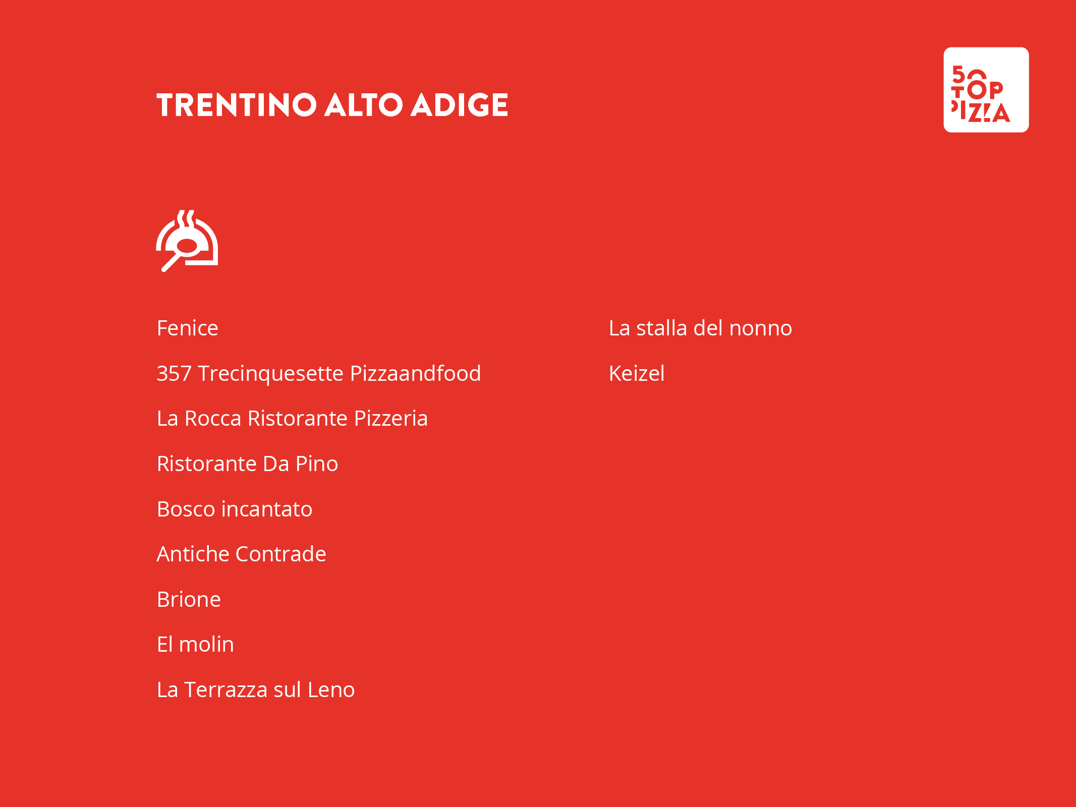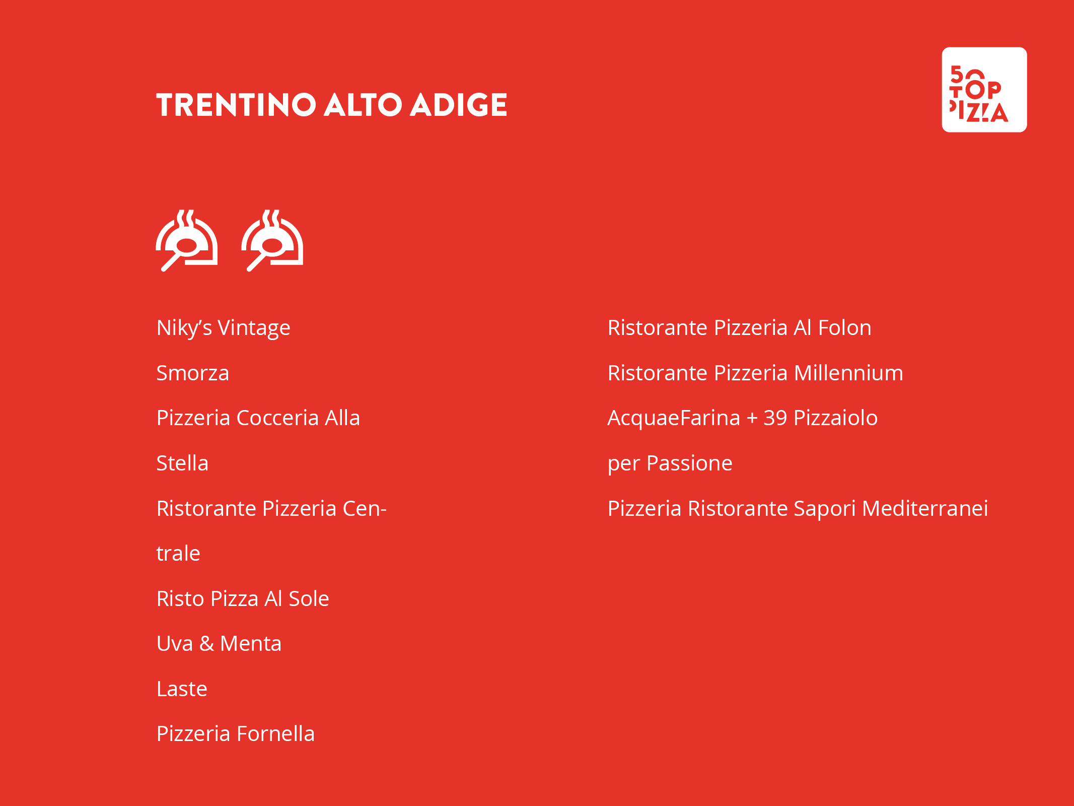 Trentino Alto Adige: 12 pizzerie due forni; 11 pizzerie un forno; totale 23