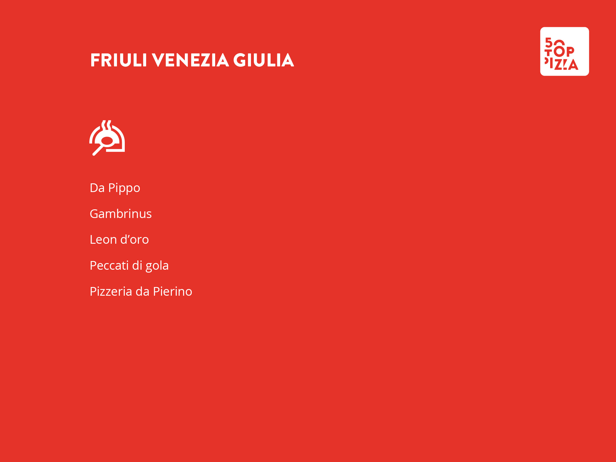 Friuli Venezia Giulia: 10 pizzerie due forni; 15 pizzerie un forno; totale 25