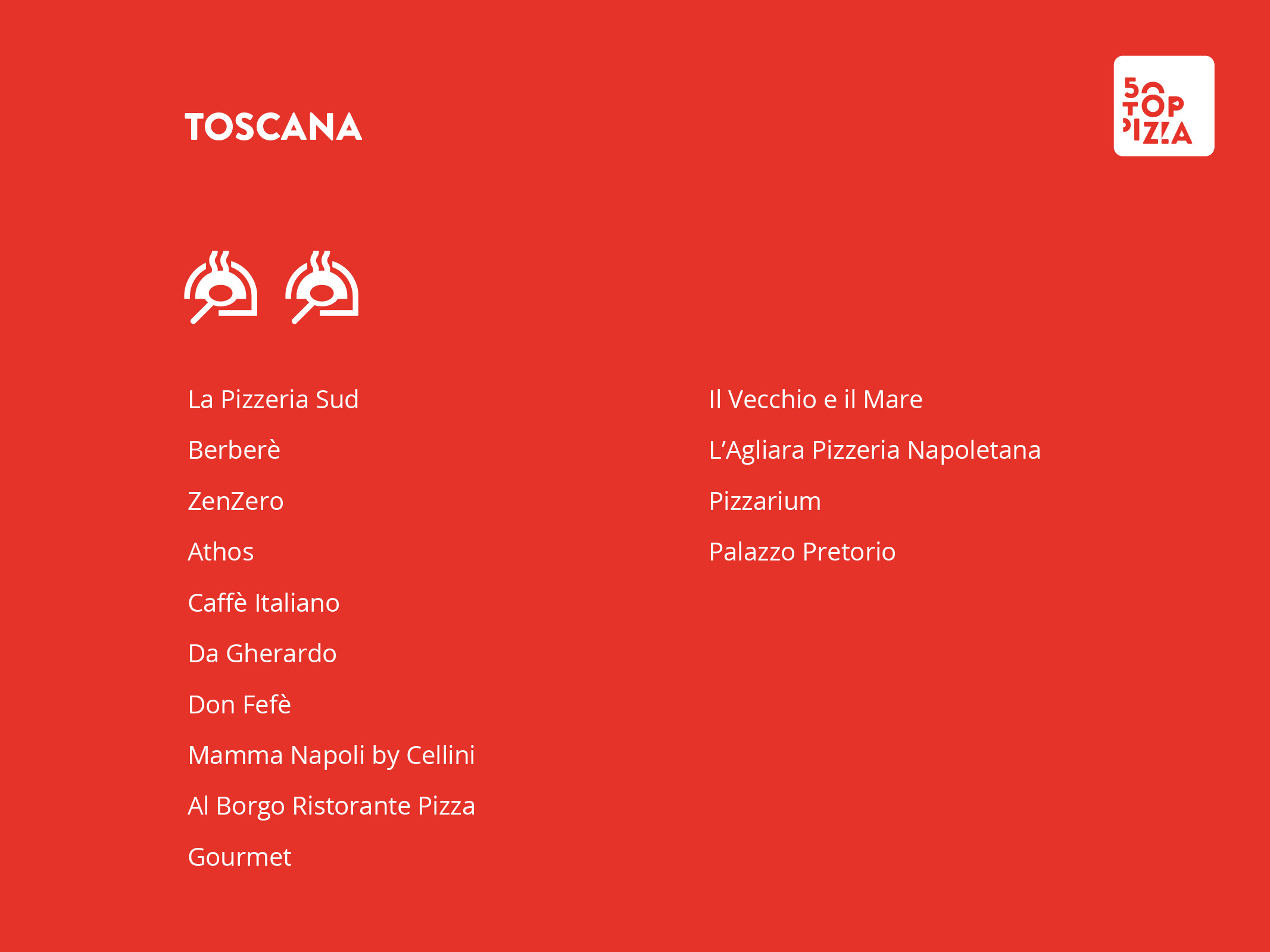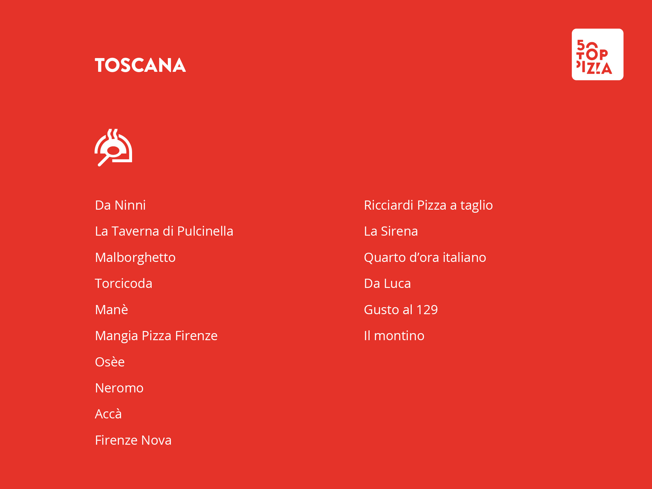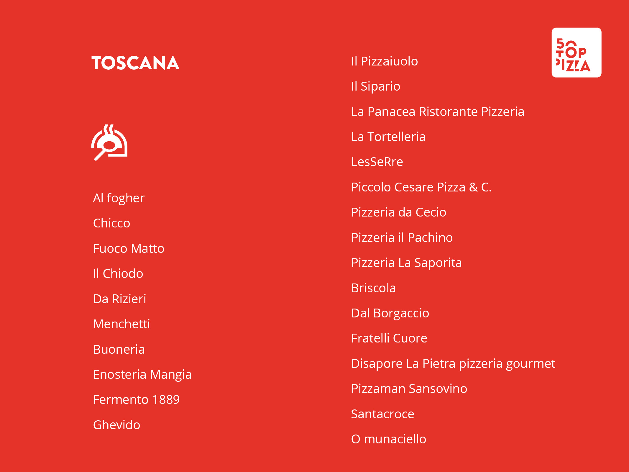 Toscana: 13 pizzerie due forni; 42 pizzerie un forno; totale 55