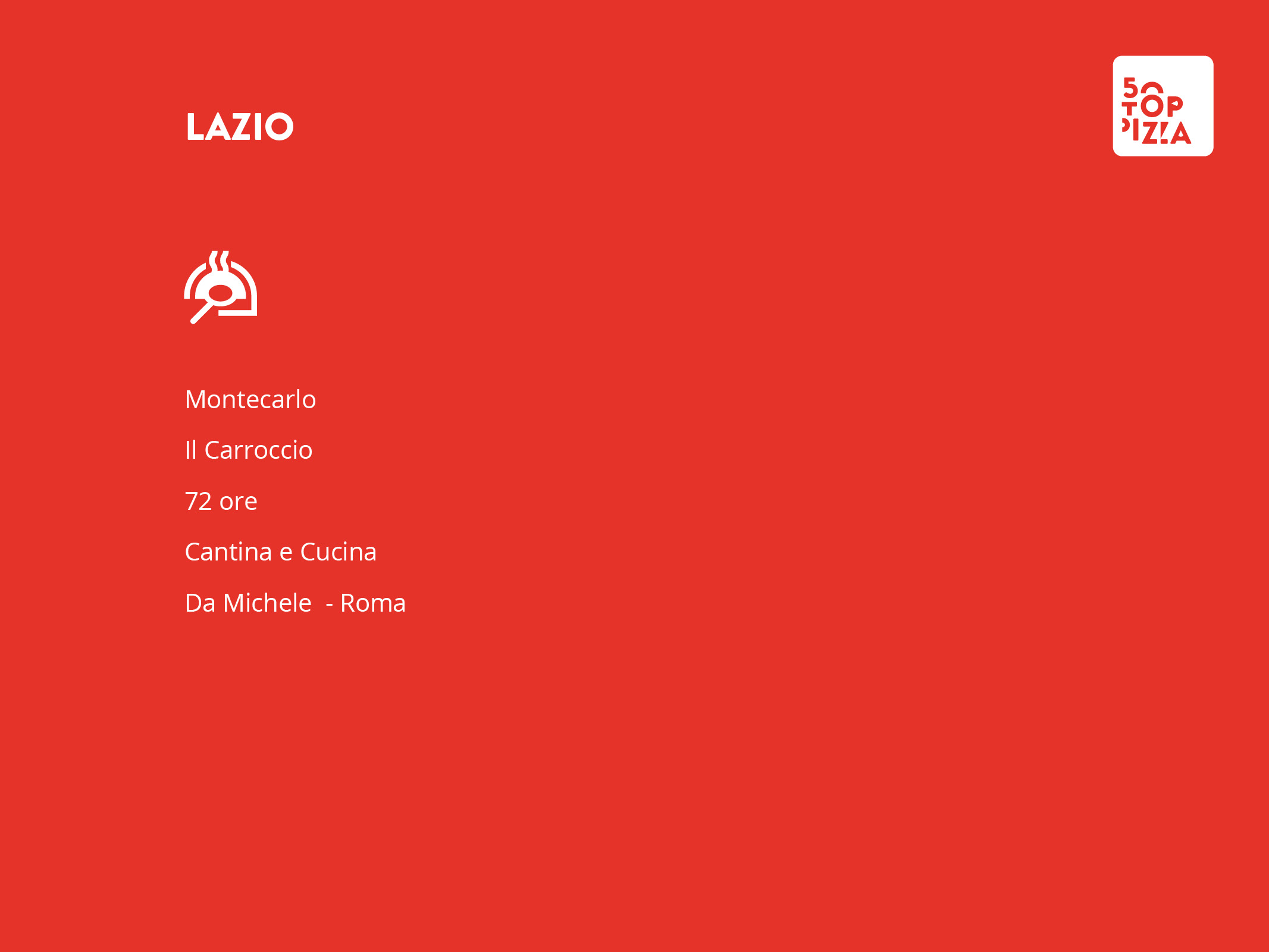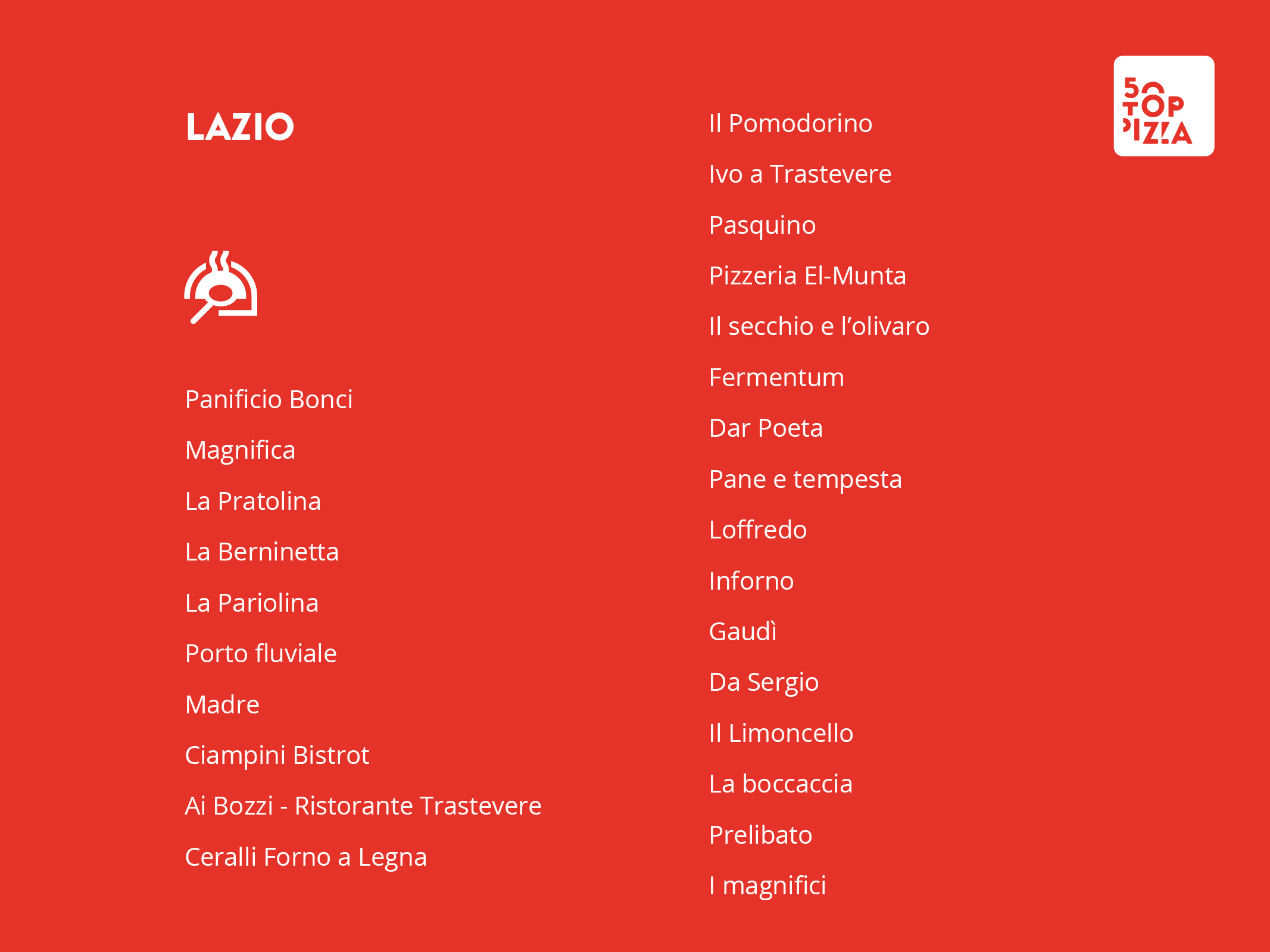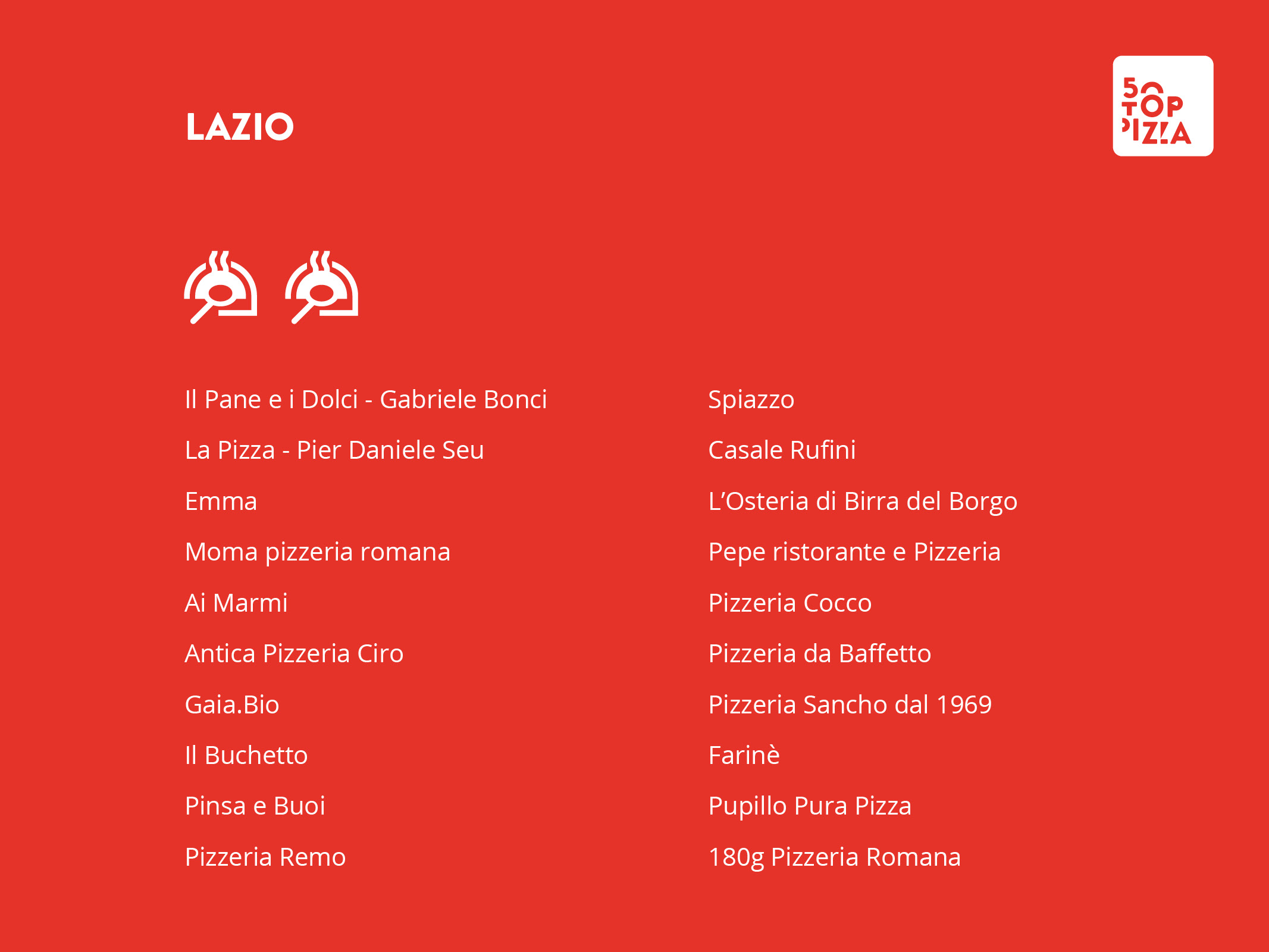 Lazio: 20 pizzerie due forni; 31 pizzerie un forno; totale 51