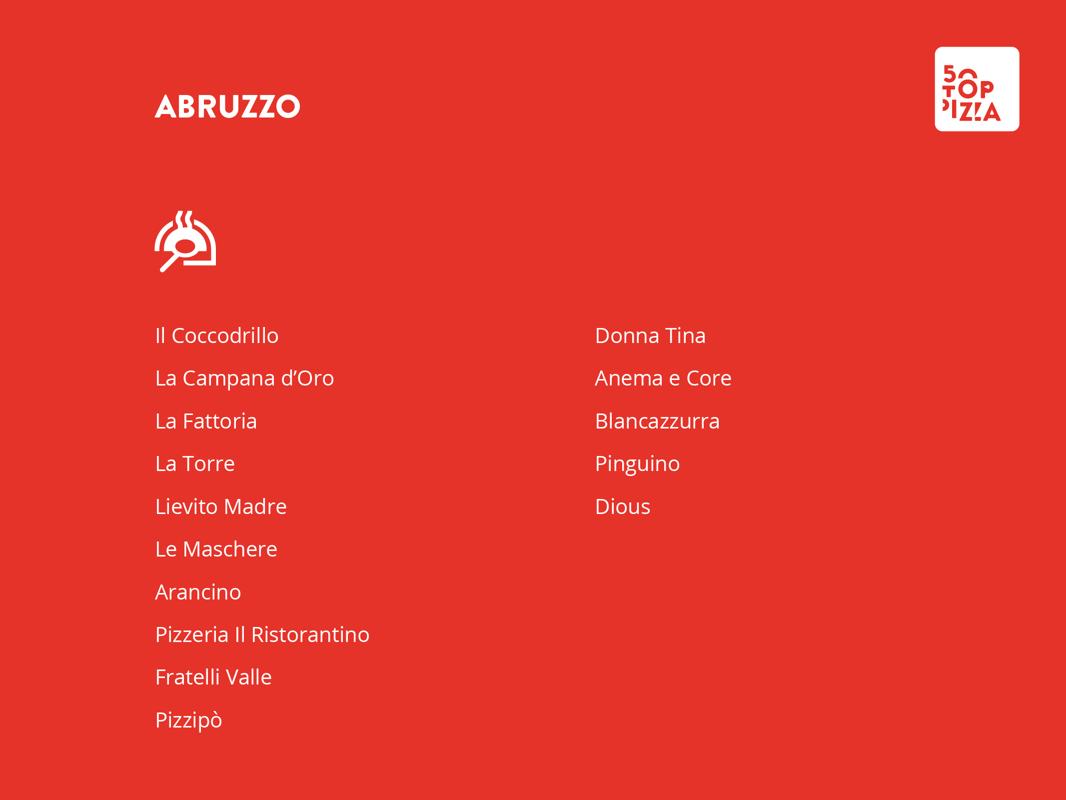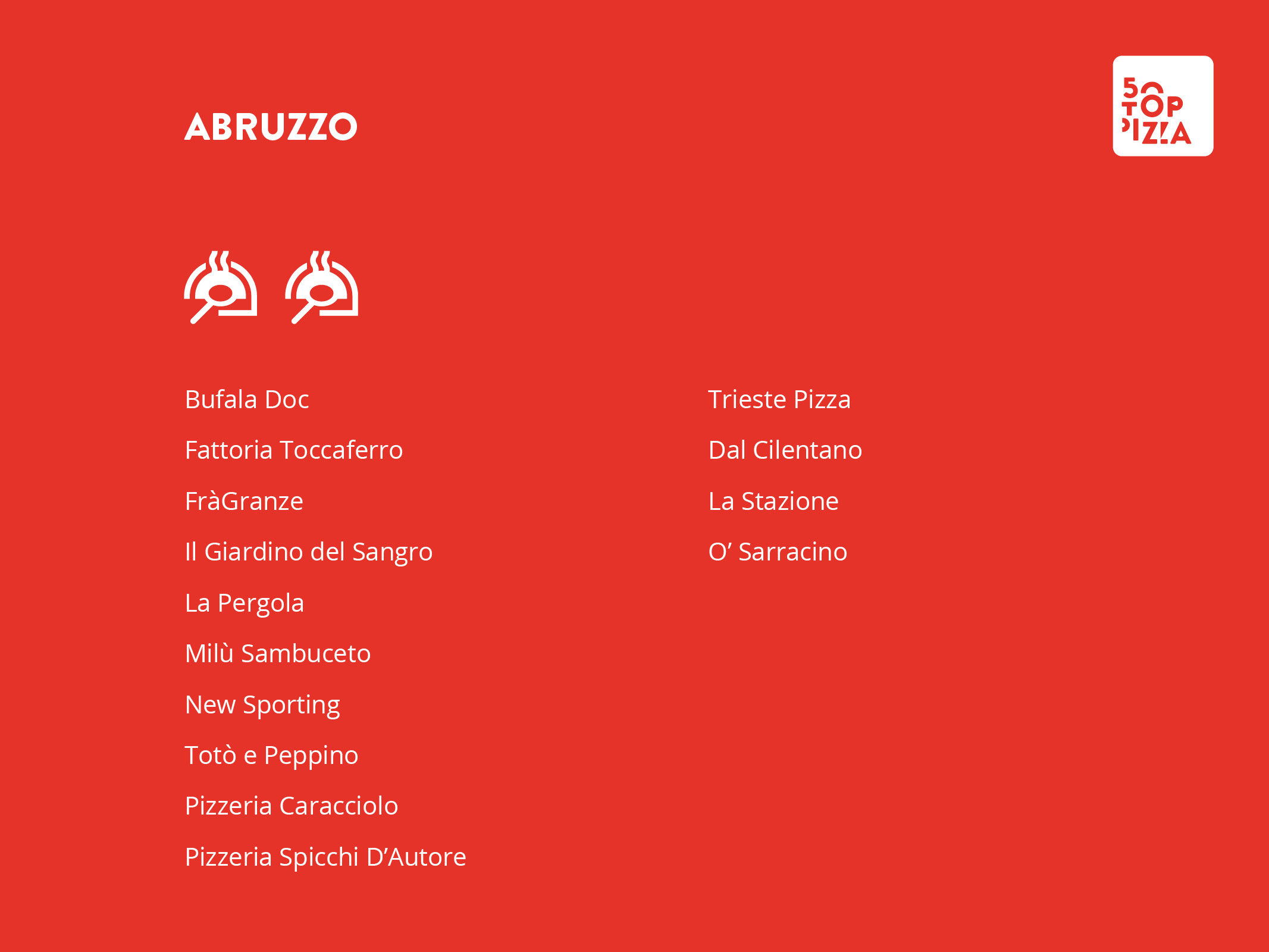Abruzzo: 14 pizzerie due forni; 15 pizzerie un forno; totale 29